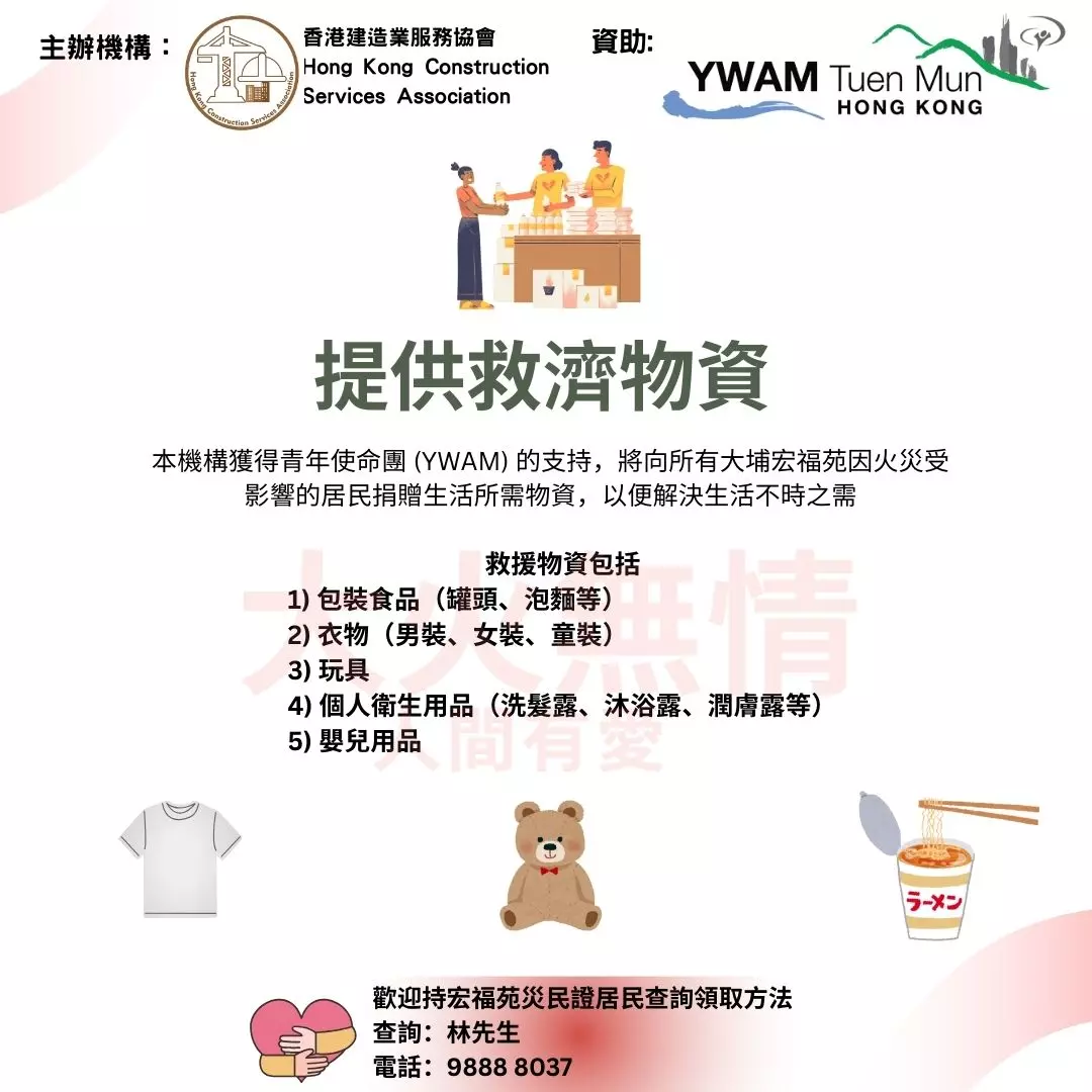 香港建造業服務協會獲「青年使命團」贊助,向有需要的 大埔宏福苑受災居民 提供 嬰幼兒所需物資。
